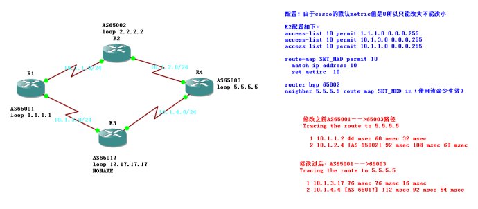修改原则,MED影响进入到当前区域的路径,MED越小越优先。