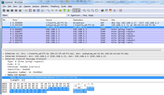 最初从PC发出的ARP请求确定IP地址192.168.1.1的MAC地址,并从相邻系统收到ARP回复。ARP请求之后,会看到ICMP报文。